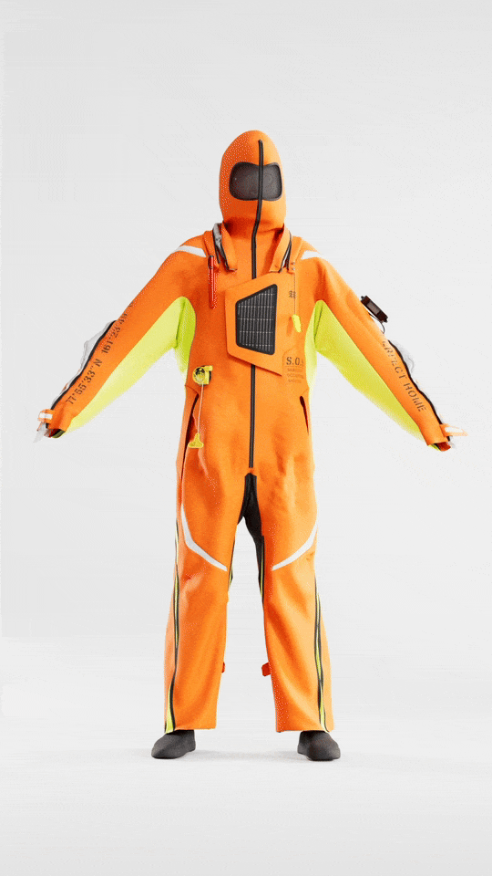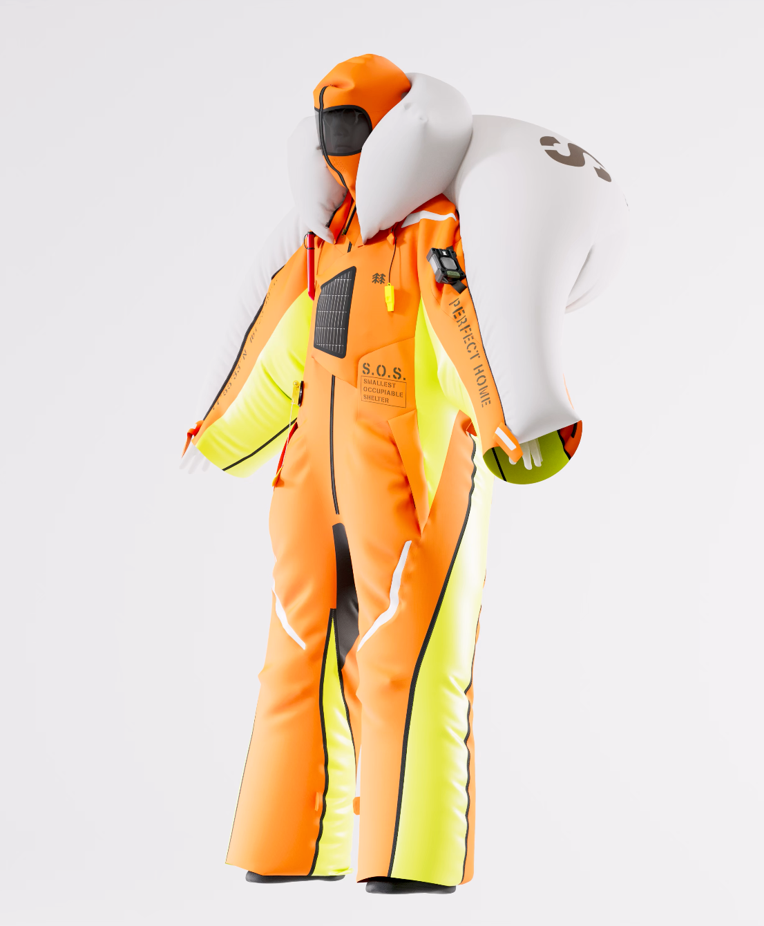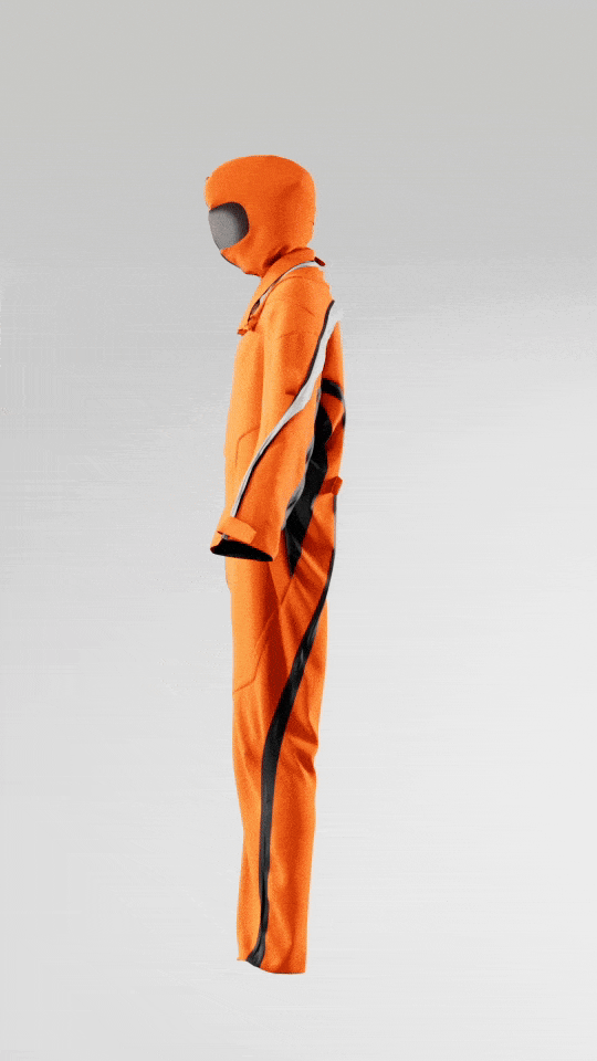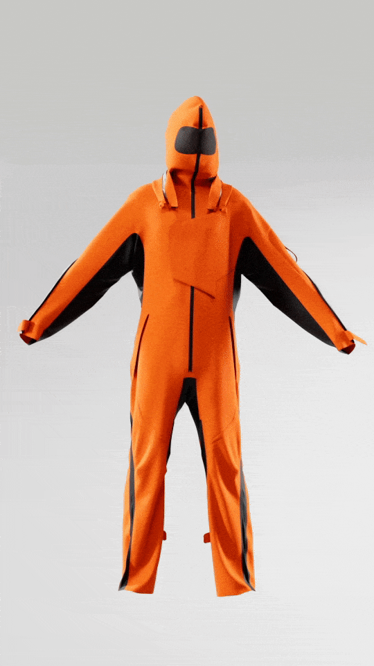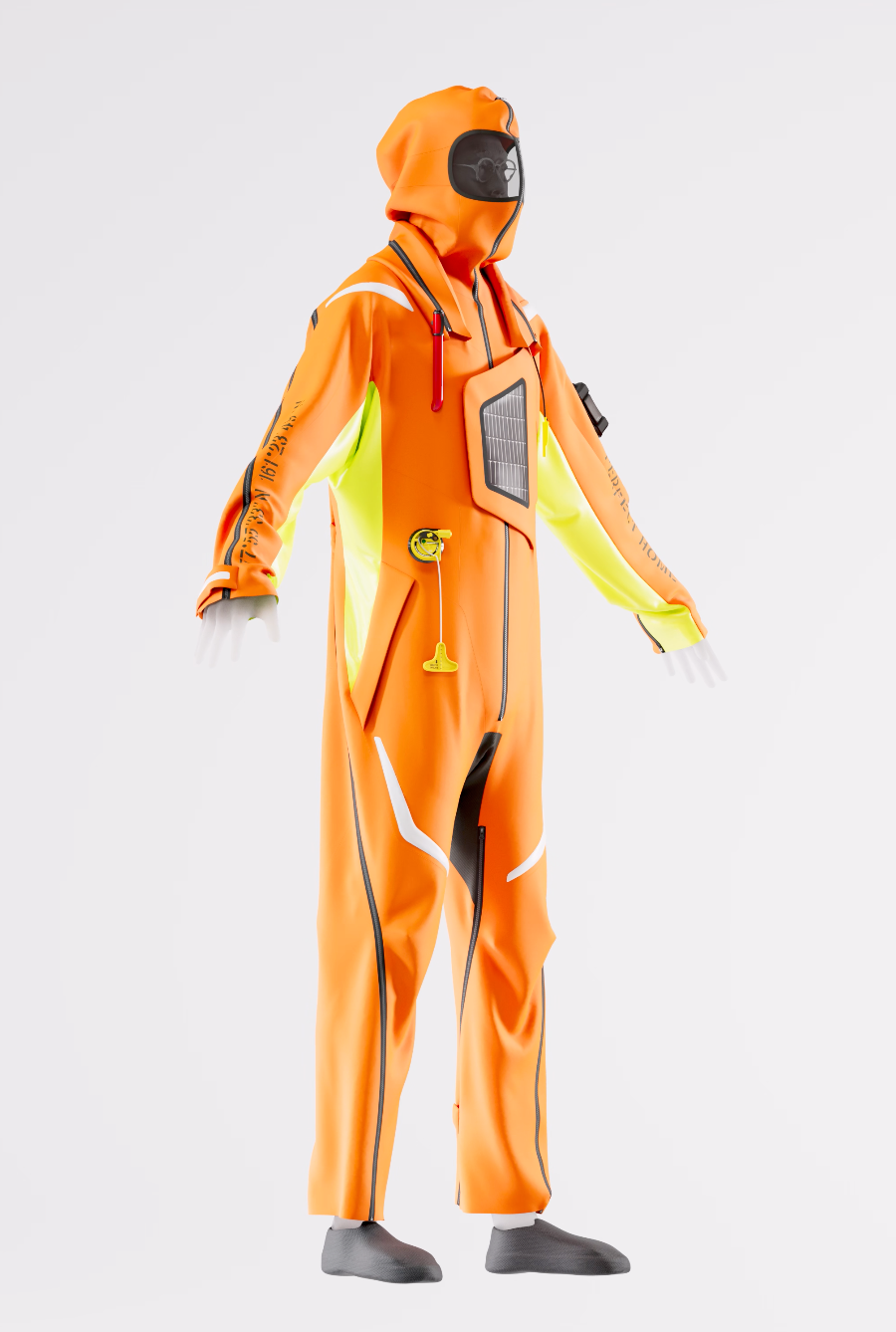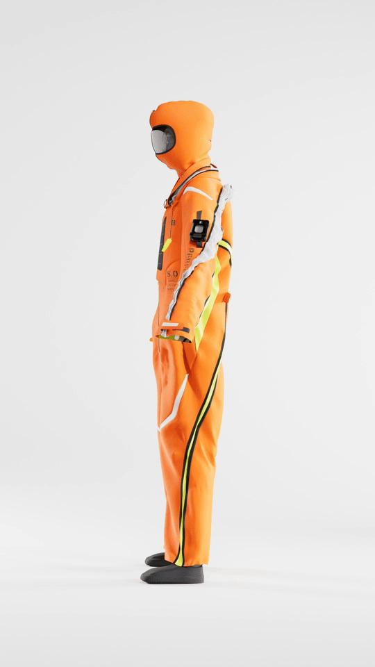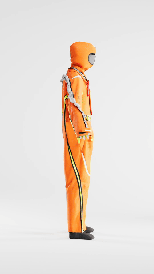 I used CLO3D to simulate the inflation of the survival suit, emphasizing its transformation into a protective, occupiable structure. To complement this, I turned to Houdini for animating the movement of secondary objects, details, and attachments.