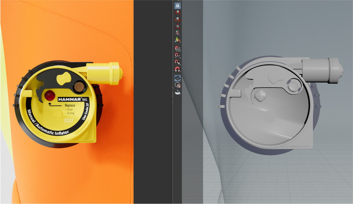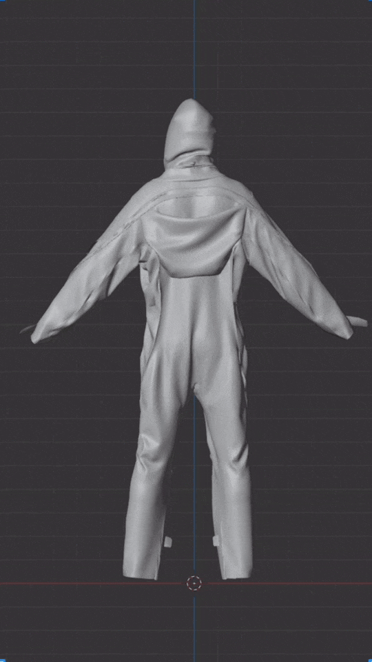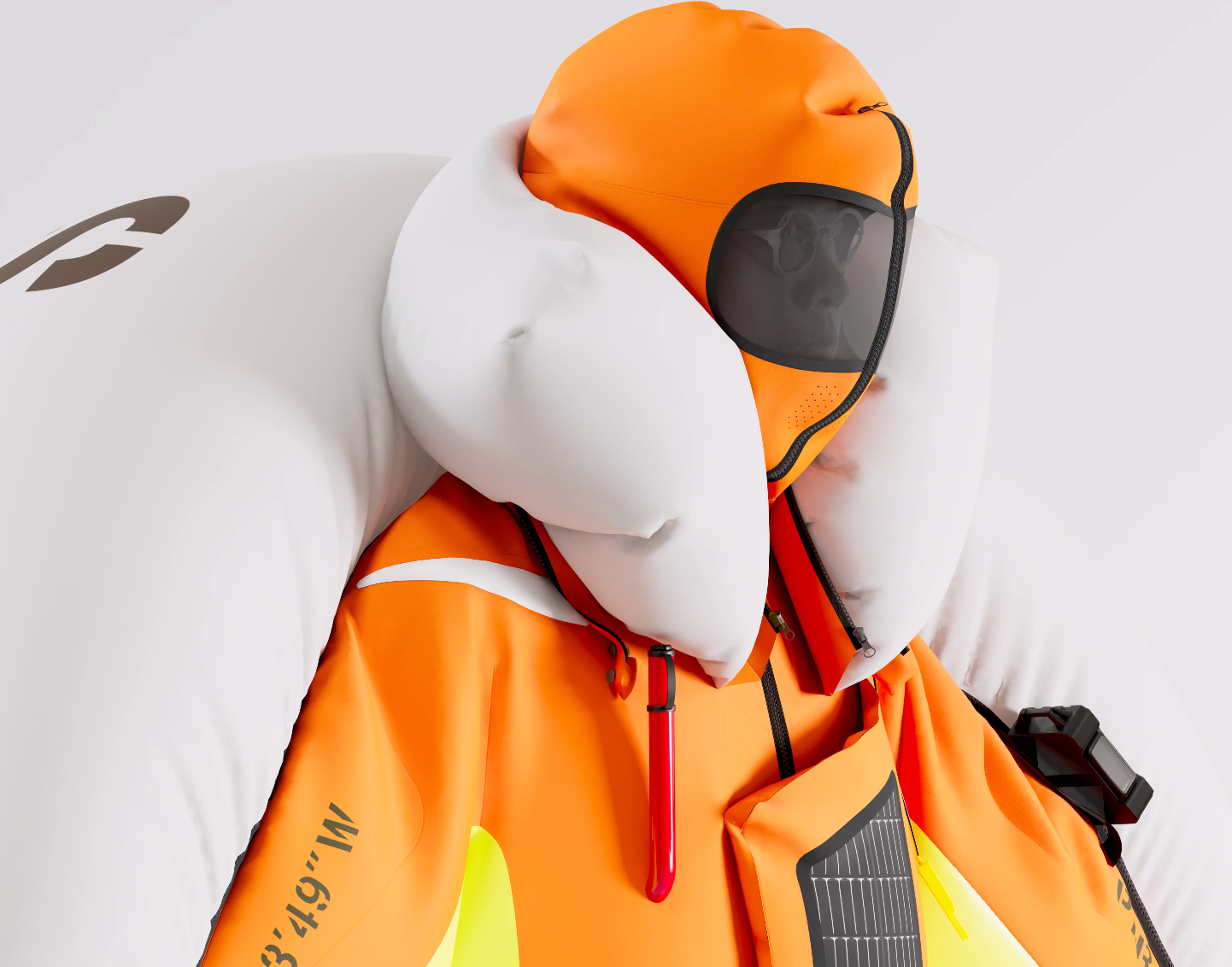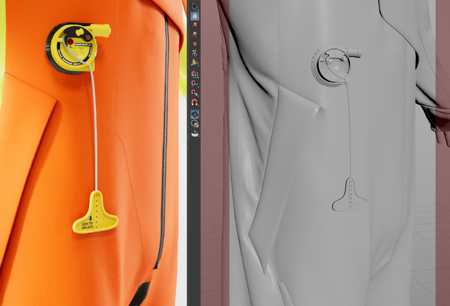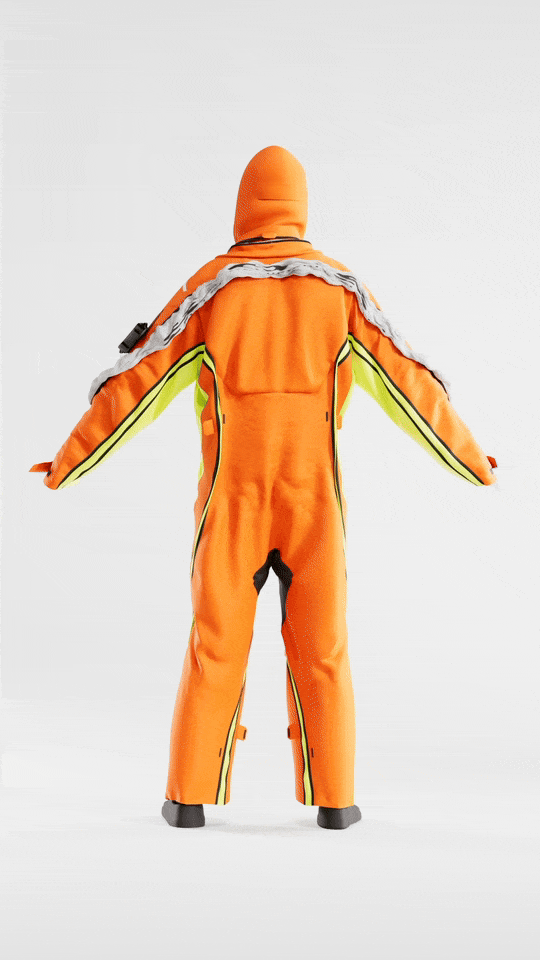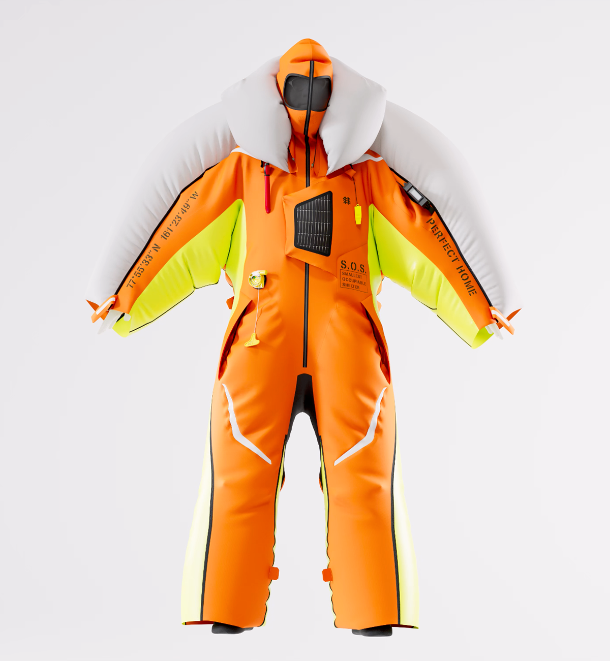 I used CLO3D to simulate the inflation of the survival suit, emphasizing its transformation into a protective, occupiable structure. To complement this, I turned to Houdini for animating the movement of secondary objects, details, and attachments.